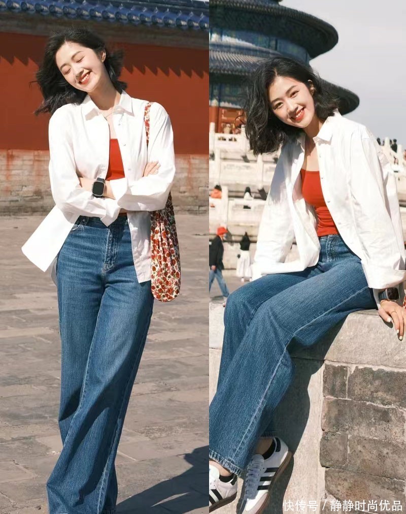衬衫的版型一般齐相比宽大,因此关于修饰比例有条件的女士,一般齐会在视觉上缩窄衬衫的详尽感。就像是图中这件白色的衬衫,就可以在衣摆处打个结,恰到公正的塑造出腰线的位置。